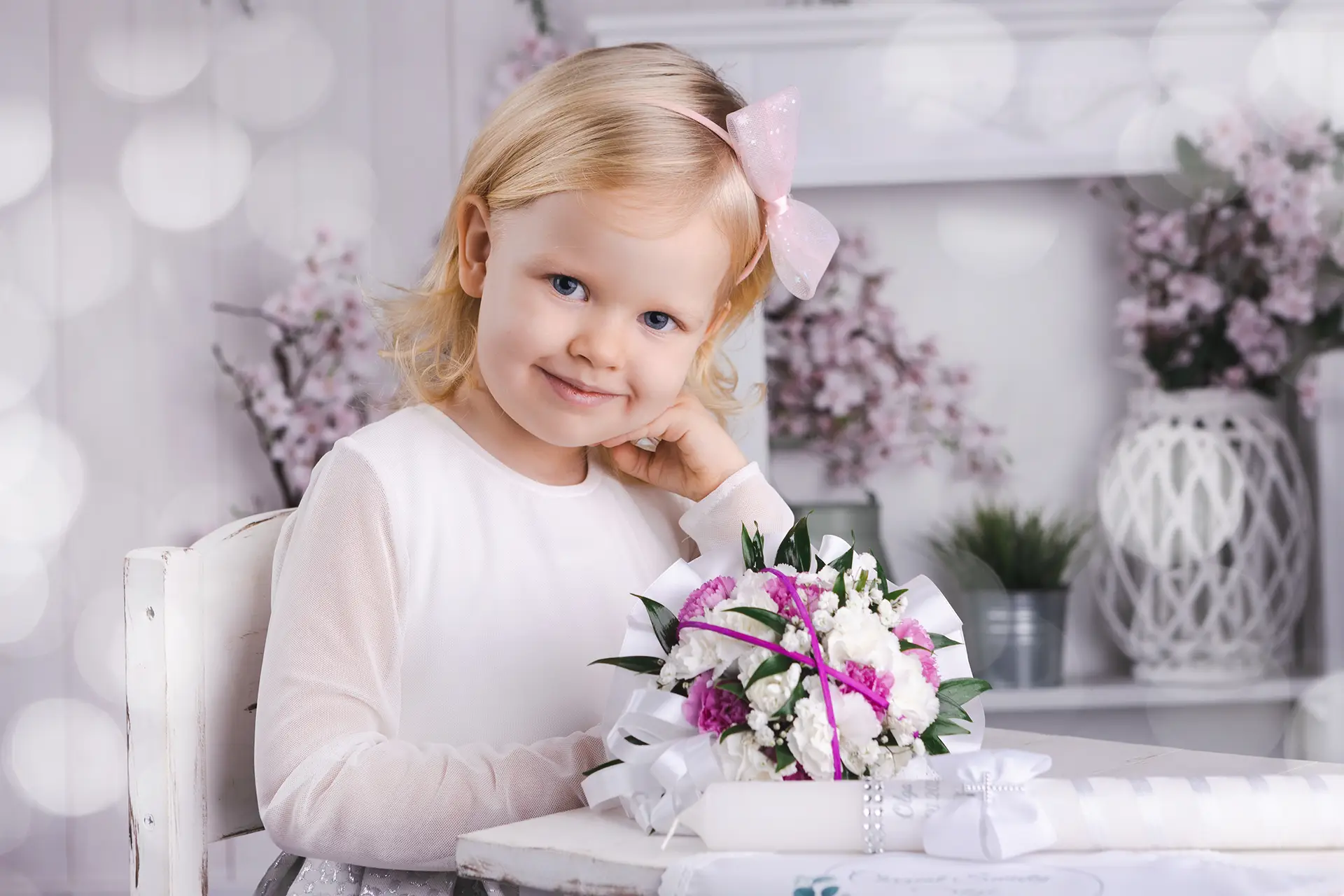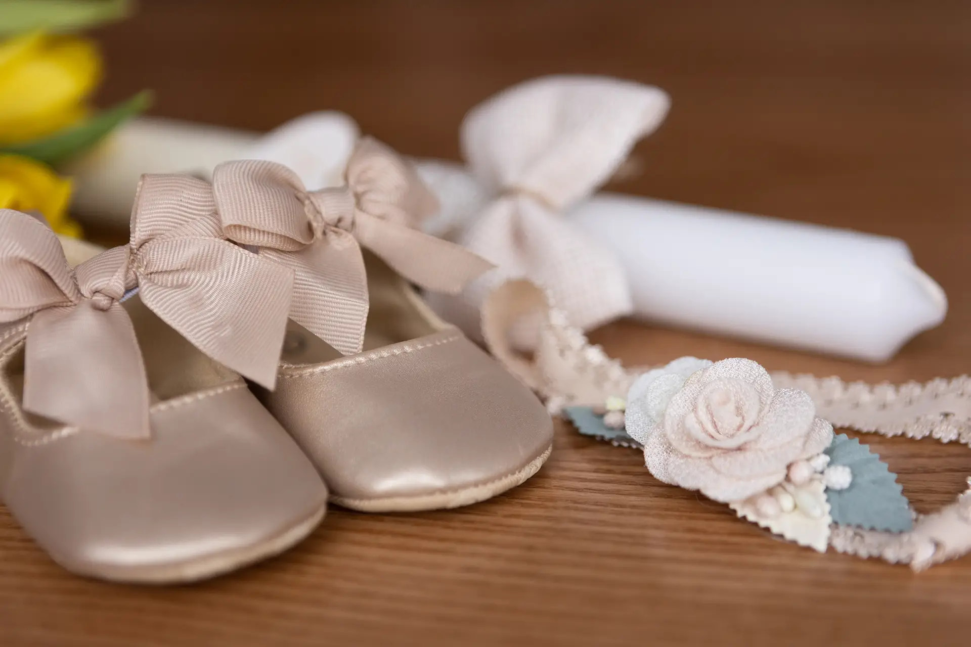 Atrybuty Chrztu: Zabierzcie ze sobą gromnicę oraz białą szatkę. Jeśli macie przygotowaną okolicznościową wiązankę kwiatów, o niej również warto pamiętać – to piękne detale do zdjęć.