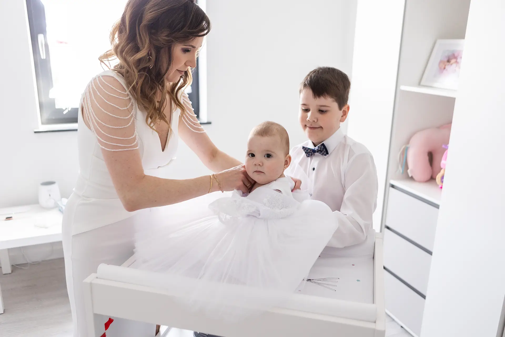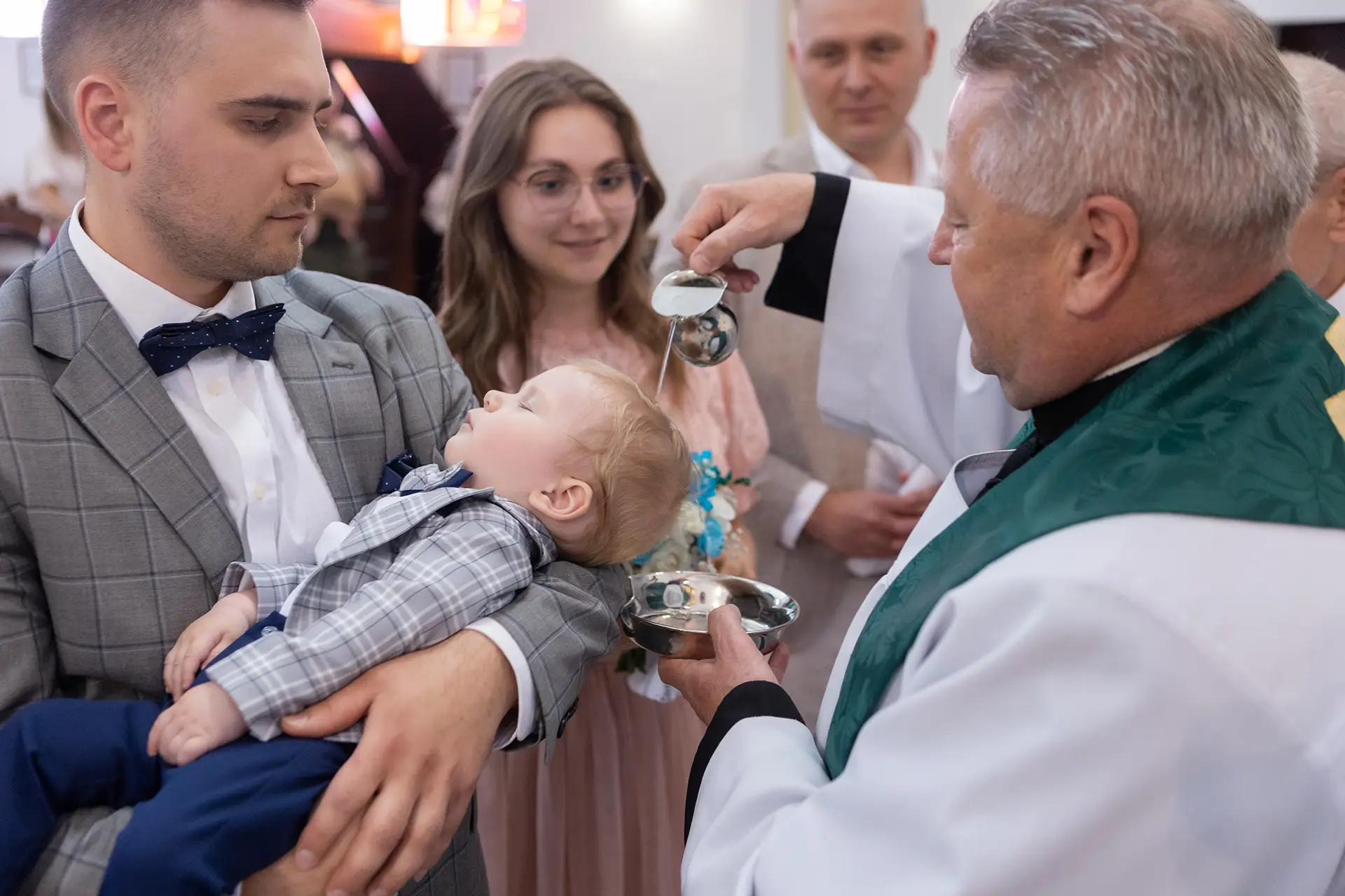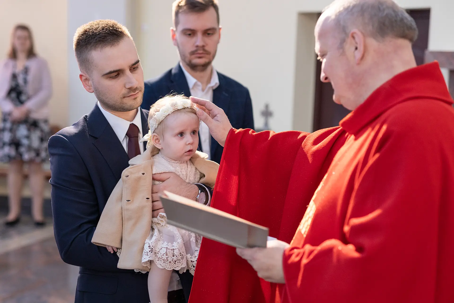 Przygotowania (opcjonalnie, ok. 1h przed mszą): Dokumentuję ubieranie maluszka w domu oraz wykonuję pierwsze wspólne zdjęcia z rodzicami i chrzestnymi w swobodnej atmosferze.