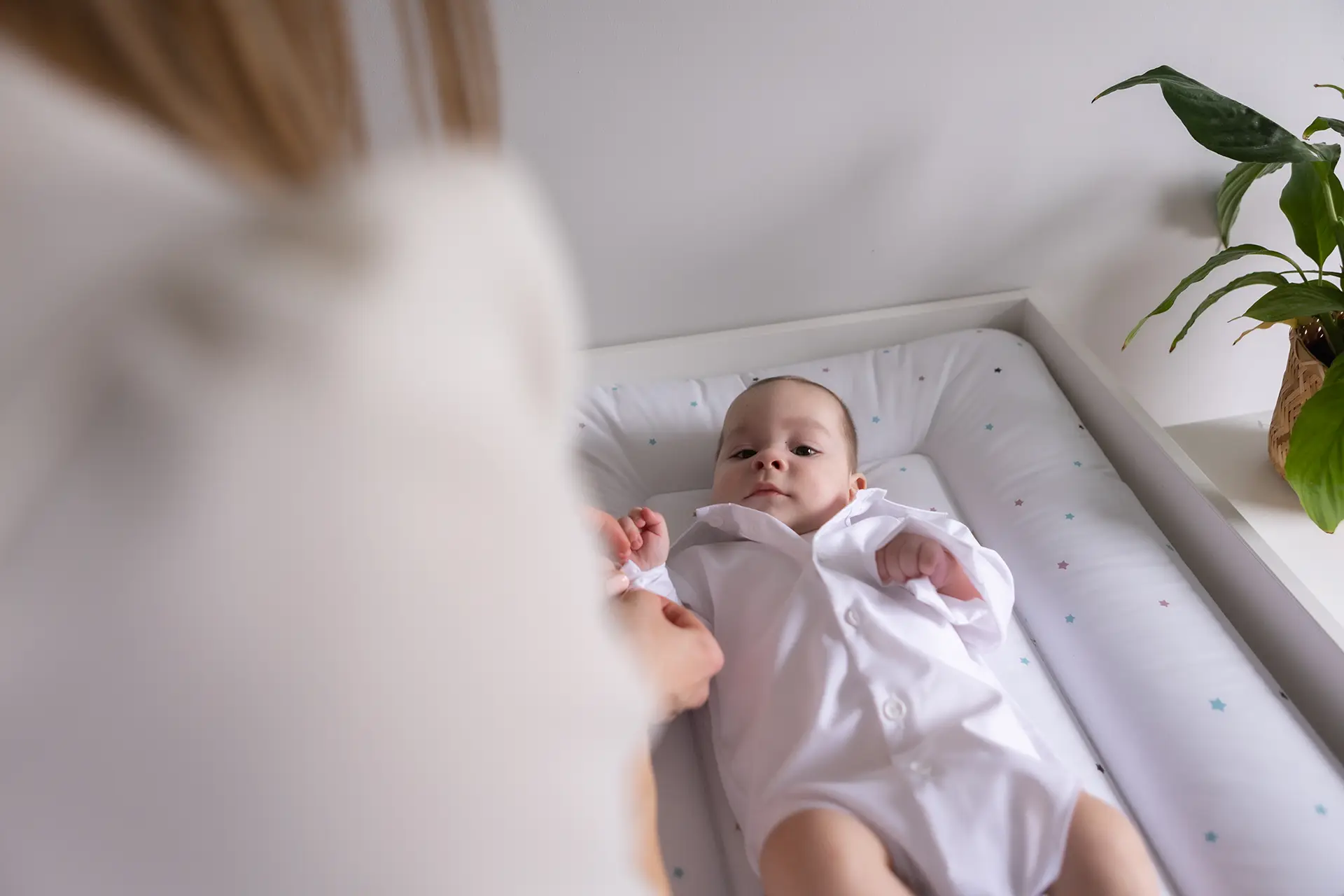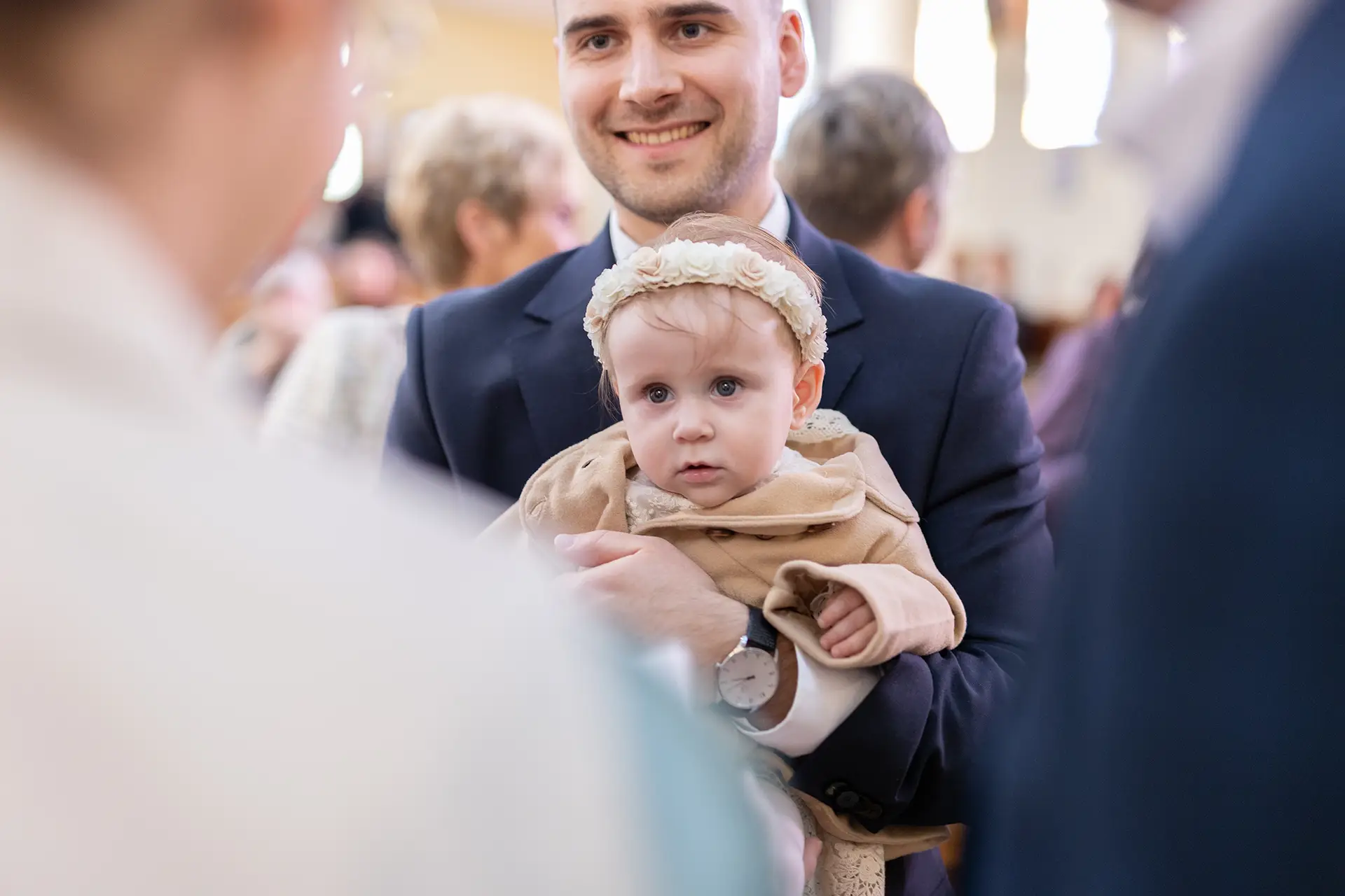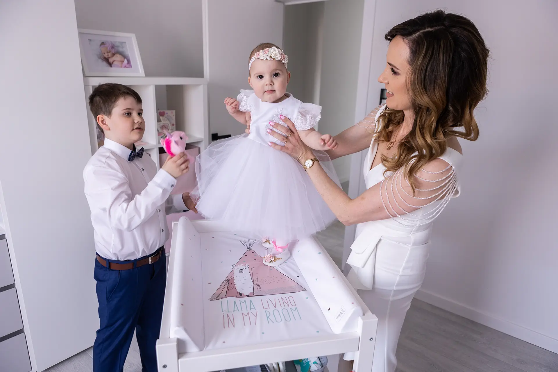 Przygotowania (opcjonalnie, ok. 1h przed mszą): Dokumentuję ubieranie maluszka w domu oraz wykonuję pierwsze wspólne zdjęcia z rodzicami i chrzestnymi w swobodnej atmosferze.