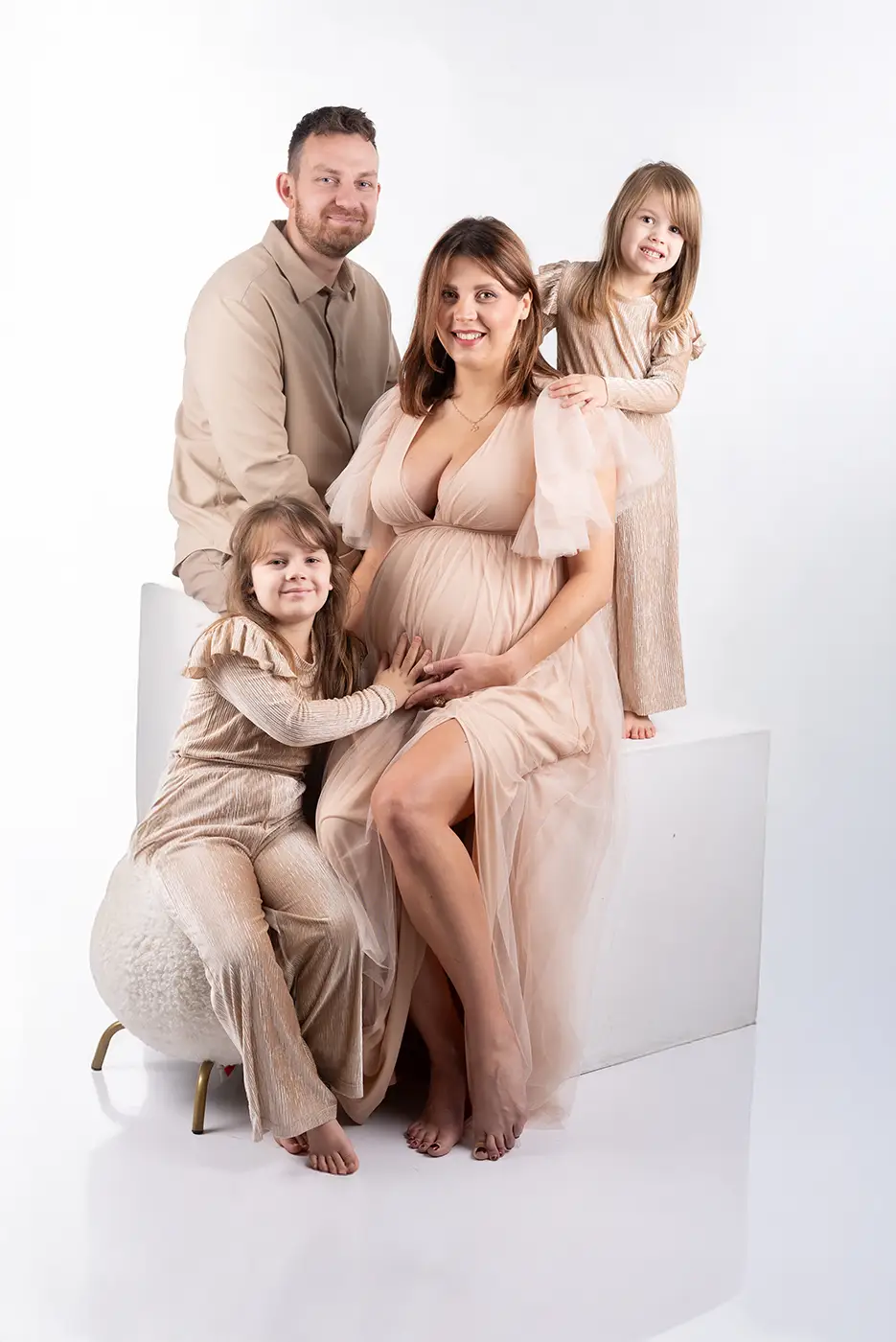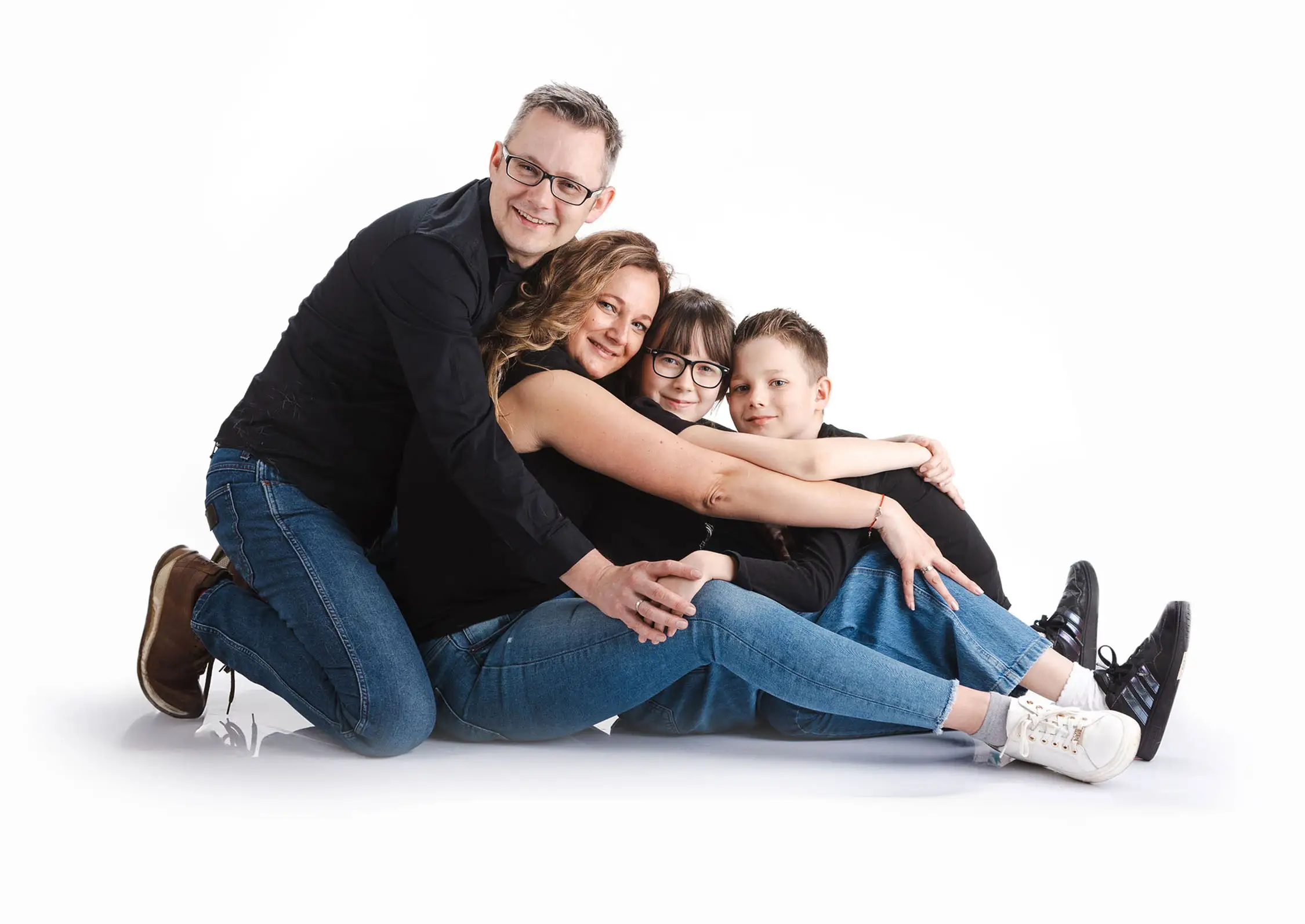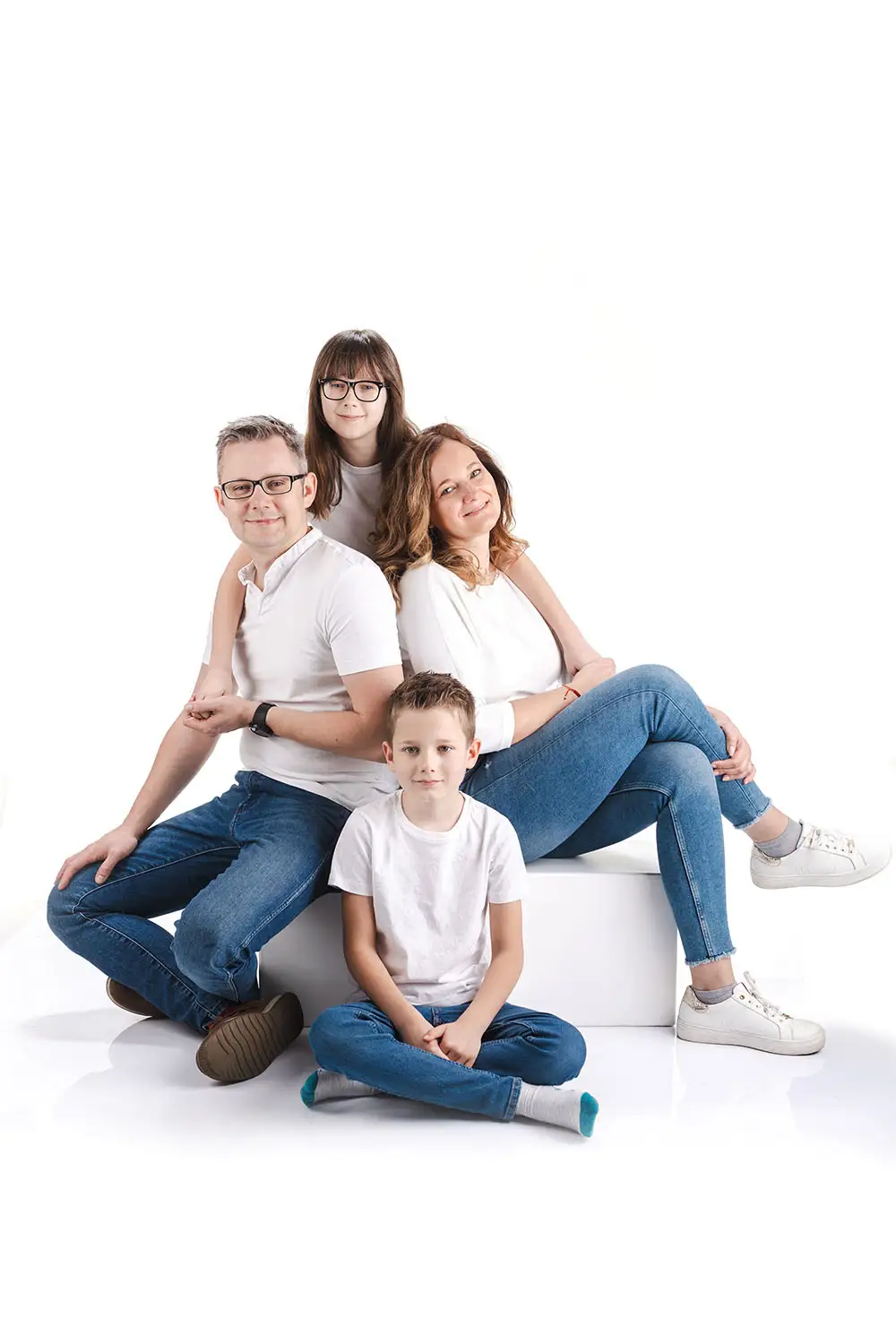 Jeżeli Wasza rodzina jest naprawdę duża, możemy zaplanować sesję etapami – tak, aby część osób przyszła na początku, a część na końcu spotkania. Pozwala to uniknąć niepotrzebnego rozproszenia, ułatwia skupienie na konkretnych relacjach i sprawia, że atmosfera w studiu pozostaje spokojna i komfortowa dla każdego.